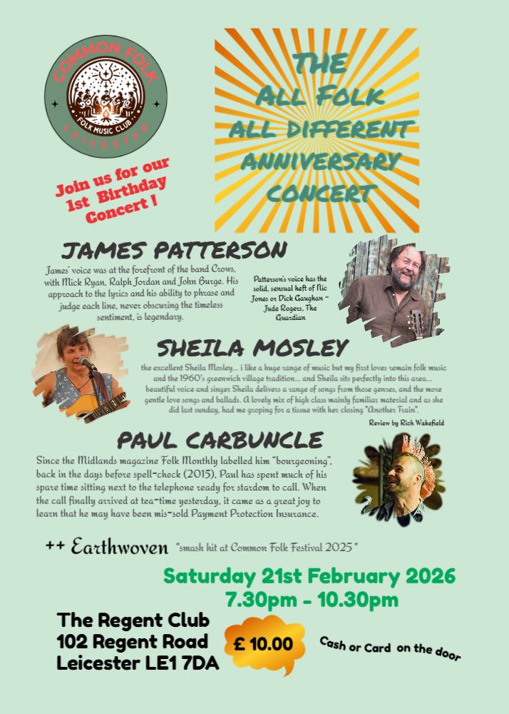 21st February 2026 (Sat.) – Common Folk Club, The Regent Club, 102 Regent Road, Leicester, LE1 7DA, along with James Patterson, Sheila Mosley, and Earthwoven. 7.30 start, £10 on the door.